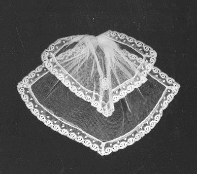 Witte tule jabot met machinale kanten rand. Werd gedragen door een ouder persoon.- Trefwoorden