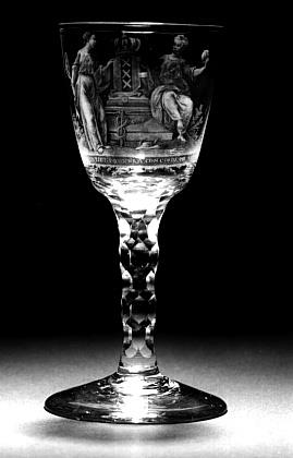 Helder kleurloos glas. Conische voet. Stam, overgaand in conische kelk met afgeronde basis. Stam en basis kelk in facetten geslepen. Op kelk het gekroonde stadswapen van Amsterdam, rustend op een document met zegel, gehouden door twee allegorische vrouwenfiguren. Links een vrouw met spiegel en slang, de Voorzichtigheid symboliserend. Op haar borst een door zonnestralen omkranst oog in een driehoek, het symbool van de Alziende God. De rechter figuur met pijlenbundel en granaatappel, de Eendracht voorstellend. Voor de sokkel een staf, hoed en drietand, de attributen van de god van de handel Mercurius en Neptunus, de god van de zee. Onder de voorstelling het opschrift: NOUS MAINTIENDRONS LA CONCORDE ME SOUTIENDRA/ (laten wij handhaven de Eendracht zal mij schragen).