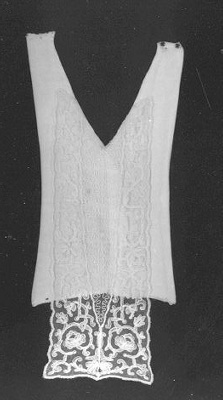 Voorkant van cremekleurige machinale kant op cremekleurige zijden crepe gezet, uit een jurk geknipt.- Trefwoorden