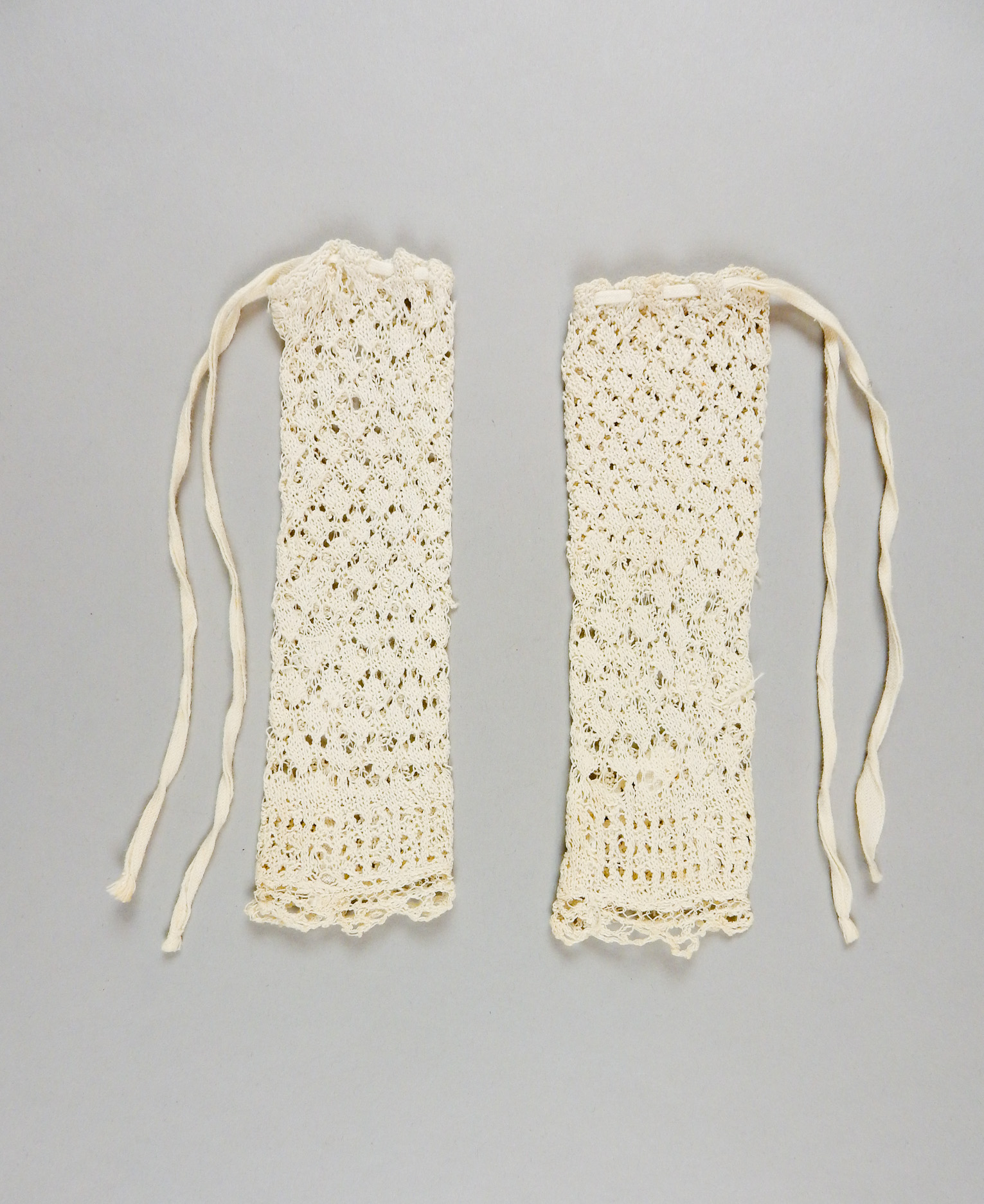 Een paar witte ondermouwtjes (z.g. armmofjes), ieder bovenaan gesloten door een wit keperbandje door gaatjes gehaald en dichtgestrikt; gebreid in kantbreiwerk (in ajour) van witte breikatoen. Patroon: opengewerkt ruitvormig kantpatroon, de brede onderrand is in een afwijkende opengewerkte breisteek gebreid en afgewerkt met open, geschulpt, gehaakt kantje.