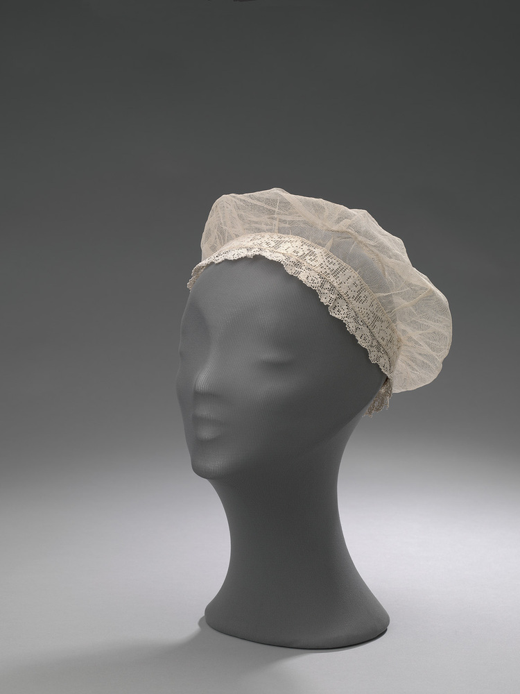 Witte muts van tule met filet rand en filet ornament op de bol. Middenachter een gedeelte met elastiek (nu uitgedroogd). Werd gedragen als ochtendmuts, in het boudoir. Werd in de jaren 1920-1930 boudoirmuts genoemd.- Trefwoorden