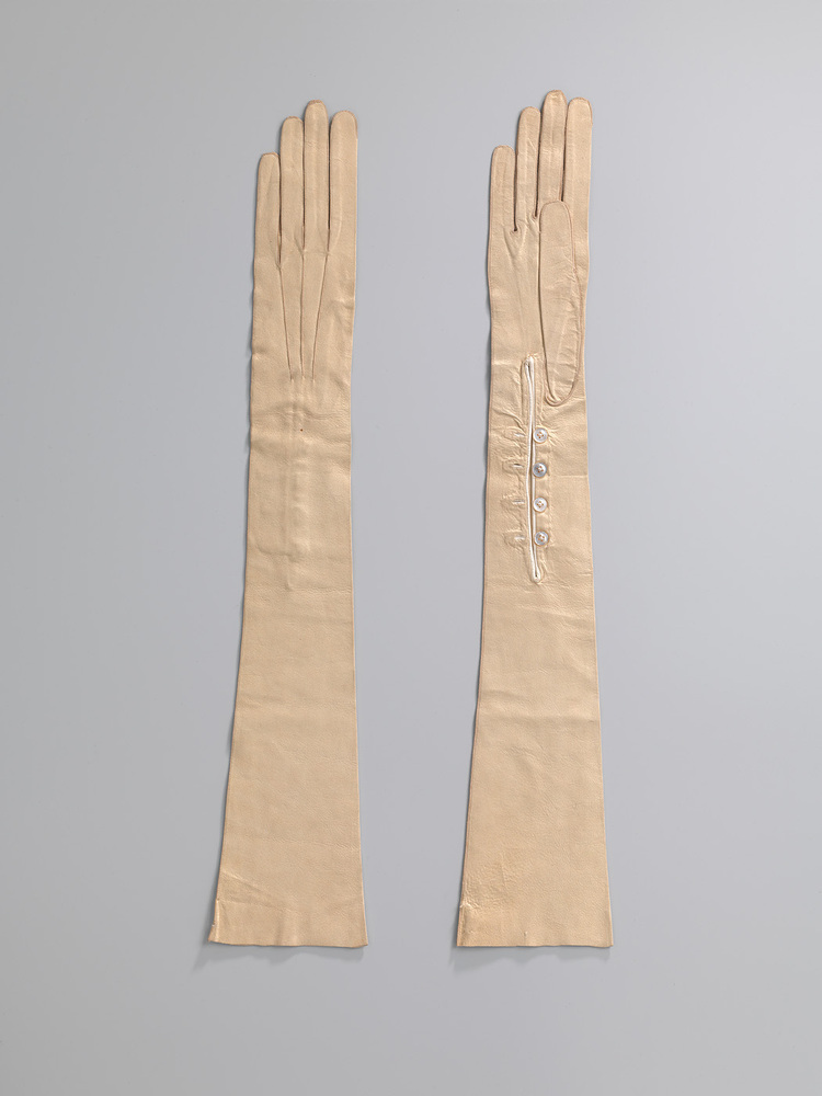 Een paar crèmekleurige suède handschoenen. Ellebooglengte met sluiting van ieder vier parelmoerknoopjes. Langs de sluiting met wit suède omgeboord. Drie stiksels bovenop de hand.- Trefwoorden