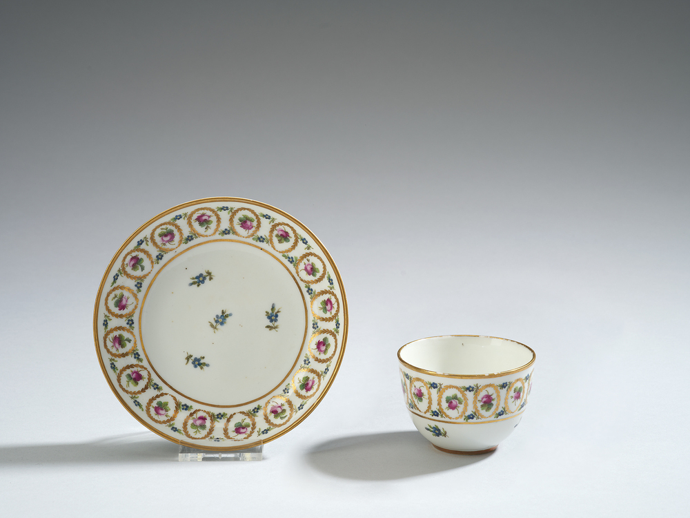 De kop en schotel zijn beschilderd met een band van ovale gouden kransjes met rozen, waartussen vergeet-mij-nietjes zijn aangebracht. Er zijn ook vergeet-mij-nietjes als strooibloemmotief gebruikt. ( Bert Vreeken)