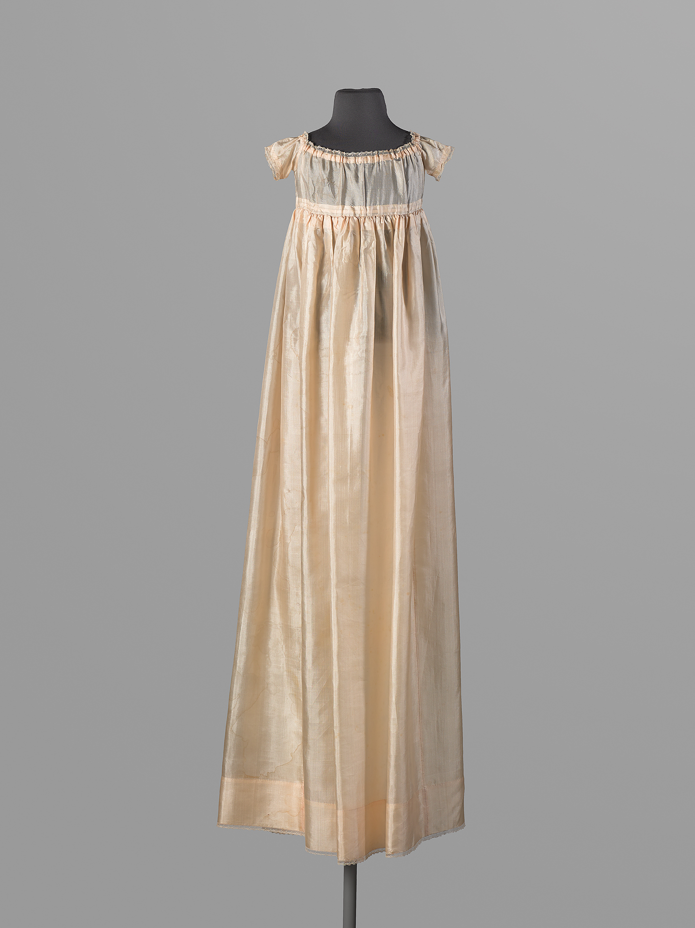 Crème doops-onderjurk van pongézijde, achter geheel geopend. Aan de hals en bij het middel gesloten door crème zijden babylintjes, gehaald door schuifjes. De lange rok is tegen het lijfje ingerimpeld. Korte, recht mouwtjes en vierkante hals, langs hals, mouwtjes en onderrand afgezet met smal geklost kantje.