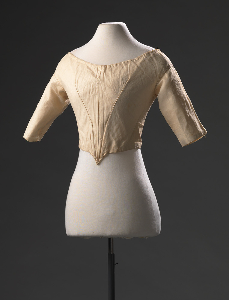 Crèmekleurig lijfje van een japon met ronde hals en korte rechte mouwen. Middenvoor loopt het lijfje in een punt, met drie baleinen, en aan weerszijden een schuine zijbalein. De hals kan middels een veterband worden ingerimpeld en wordt aan de achterzijde gestrikt. Middenachter een sluiting met elf haken en gefestonneerde oogjes, verborgen door een bies.