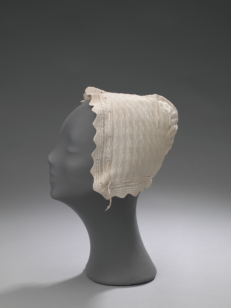 Witte katoenen, handgebreide muts. Twee banden om de bol om in te halen. Mutsen als deze werden lange tijd gedragen in de 19de eeuw.- Trefwoorden