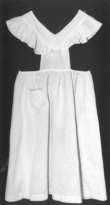 Vermaakte witte schort. Tailleband is vermaakt, waardoor er voor de gekruiste schouderbanden geen knoopsgaten zijn.- Trefwoorden