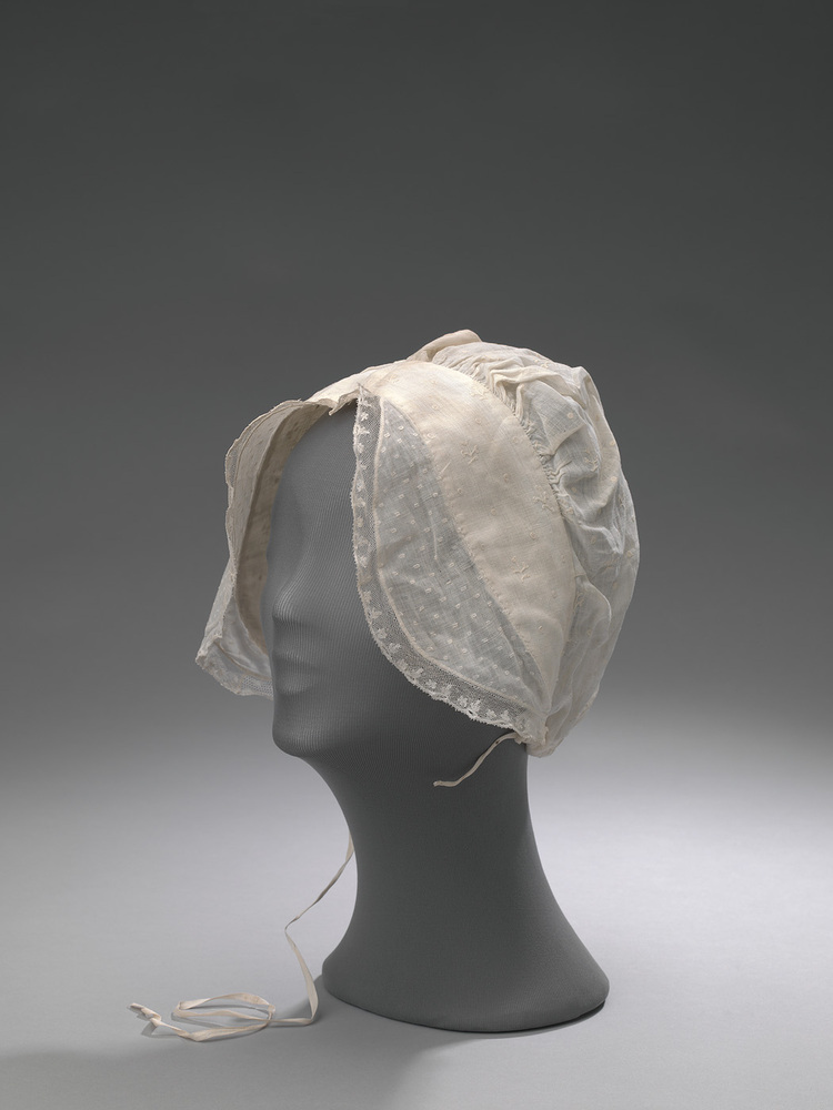 Muts of huismuts van wit katoen batist. De voorrand is geweven met een nopjes motief en is gedeeltelijk gevoerd. Langs de randen versierd met Mechels kloskant. De bol is gemaakt van getamboereerde linnen batist. Lange banden om in te halen, over het hele hoofd. Slippen opzij van ingeweven batist past in de 18de eeuw.- Trefwoorden