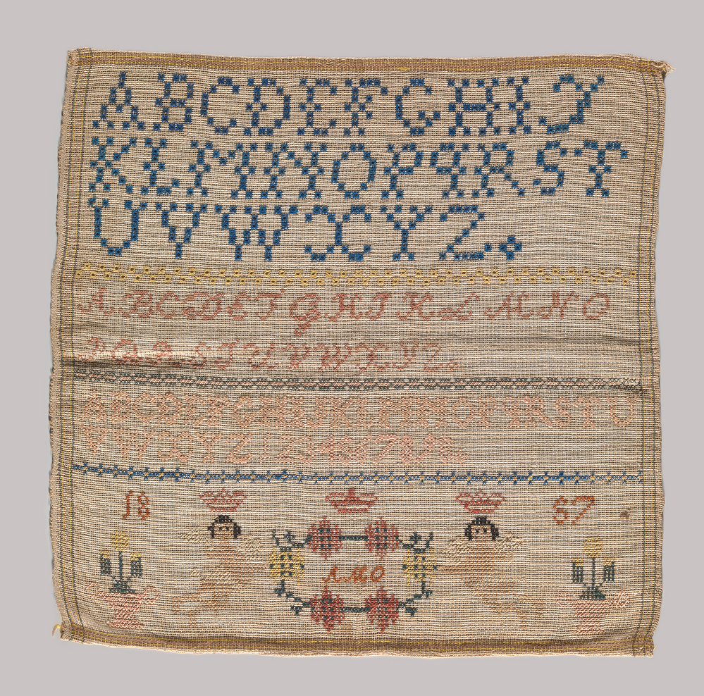 Op deze middelgrote merklap (35,5 x 36,5 cm) uit 1857 heeft een onbekende borduurster ijverig haar alfabetten geoefend. Ze gebruikte hiervoor zijden garen op een katoenen stramien.