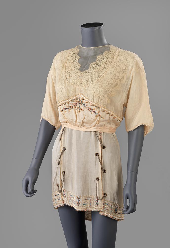 Crèmekleurige tuniek van dunne zijde. Het lijfje is vanaf een verhoogde taillelijn overtrokken met zijde voile in dezelfde kleur. Tussen de zijde en voile een kanten strook aan weerzijden over de schouders, die tot aan de taille loopt, bij de taillelijn voor en achter licht ingerimpeld. Aangeknipte mouwen, die bij de rand afgezet met een rand van glaskralen. De verhoogde taillelijn is geaccentueerd door gekleurde kralen (goud, rood, blauw en wit). Op de taille een gevouwen vast ceintuur met middenachter een opgenaaide rozet met twee afhangende slippen. Sluiting middenachter met drukknopen.