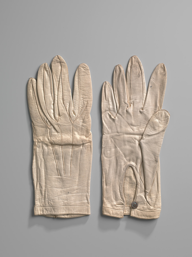 Een paar witte dameshandschoenen van glacéleer. Gesloten door één metalen knoopje. Bovenop drie stiksels in dezelfde kleur. De handschoenen komen uit het bezit van mevr. J. Markse uit Amsterdam.- Trefwoorden
