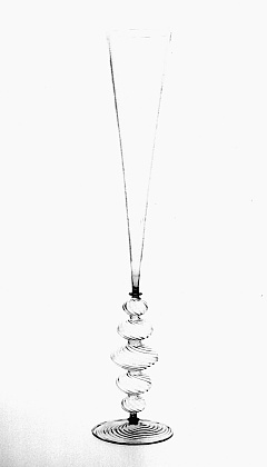 Helder kleurloos glas. Licht conische voet. Basisschijf. Holle stam met vijf knopen en schijf. Voet en stam met gedraaid, in de vorm geblazen ribbelpatroon. Hoge conische kelk.