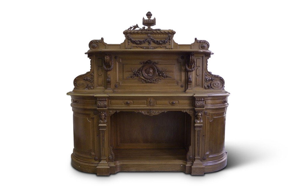 - Het grote buffet werd waarschijnlijk rond 1870 door de Parijse firma Mercier Frères vervaardigd voor de eetkamer van Herengracht 502, in opdracht van het echtpaar Van Loon-Borski, de toenmalige eigenaren. Het buffet, zo’n 2.40 m breed en 1.80 m hoog, vormt een echt statement met een strenge classicistische opbouw, verlevendigd door bloemenkransen, rozetten, voluten en vrouwenkoppen. Het meubel is modieus. In diverse contemporaine catalogi zijn verwante ontwerpen te vinden. ( Jaap Boonstra)