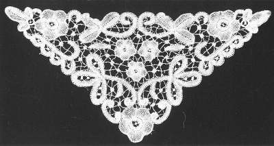 Witte gekloste driehoekig ornament (duchessekant). Werd op kleding gezet of in huis gebruikt als ornament.- Trefwoorden