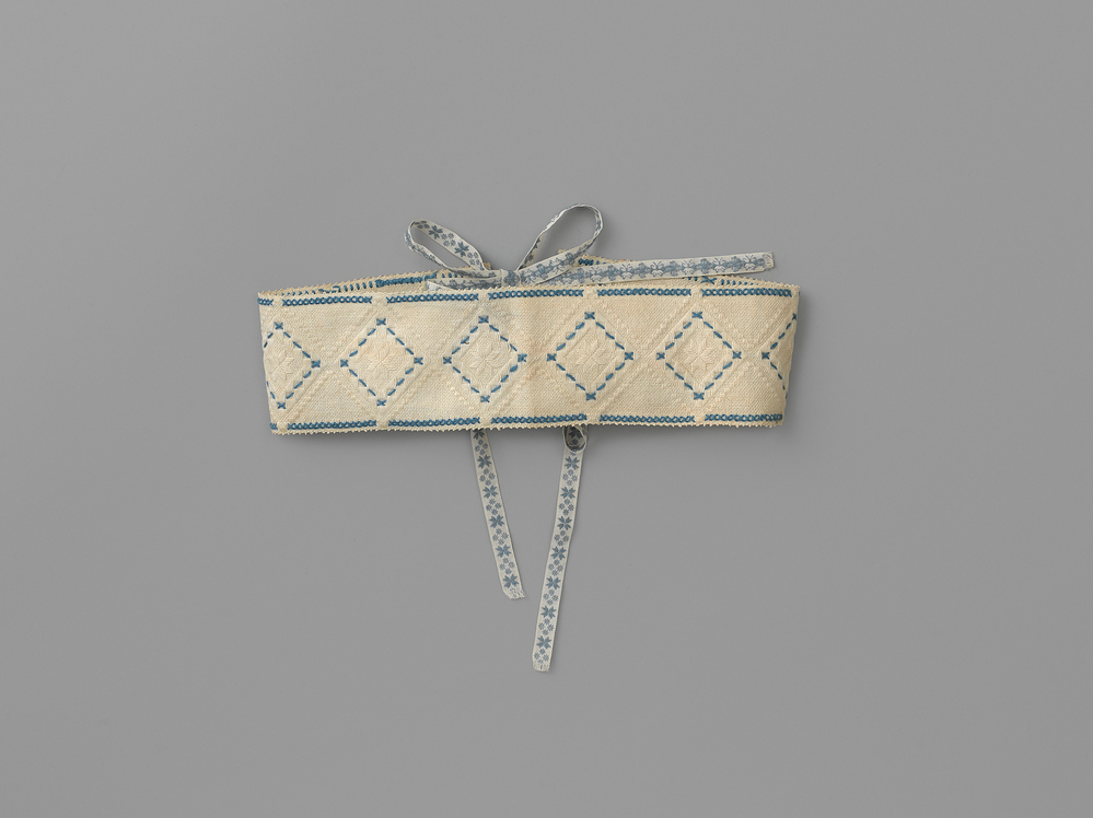 Band of ceintuur voor een kind, blauw met wit handgeborduurd in geometrische motieven, sluiting met twee banden op de rug. Mogelijk vermaakt uit een band.