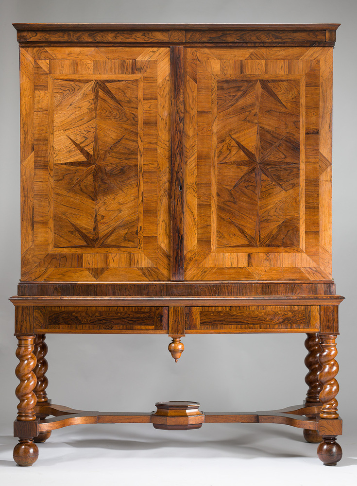 Tweedeurs sterkabinet op open voet, exterieur gefineerd met palissander op eiken blindhout, interieur zeer rijk uitgevoerd met schildpadfineer, ivoor en geometrische marqueterie. Gesloten, blokvormige bovenkast rust op vier getorste poten op bolpoten, verbonden door een gaffelvormig sportenkruis en bovenregels waartussen twee laden. Achter twee op speunen draaiende deuren bevindt zich een interieur met tientallen laden voor een verzameling, rondom een centraal middenvak waarin een ‘perspectiefje’; een miniatuur interieur met zuilen, spiegelwanden, een gewelf en een tegelvloer. Boven en onder dit middenvak zijn de laden uitgevoerd met bijpassende architectonische elementen als een gebroken fronton, consoles e.d.