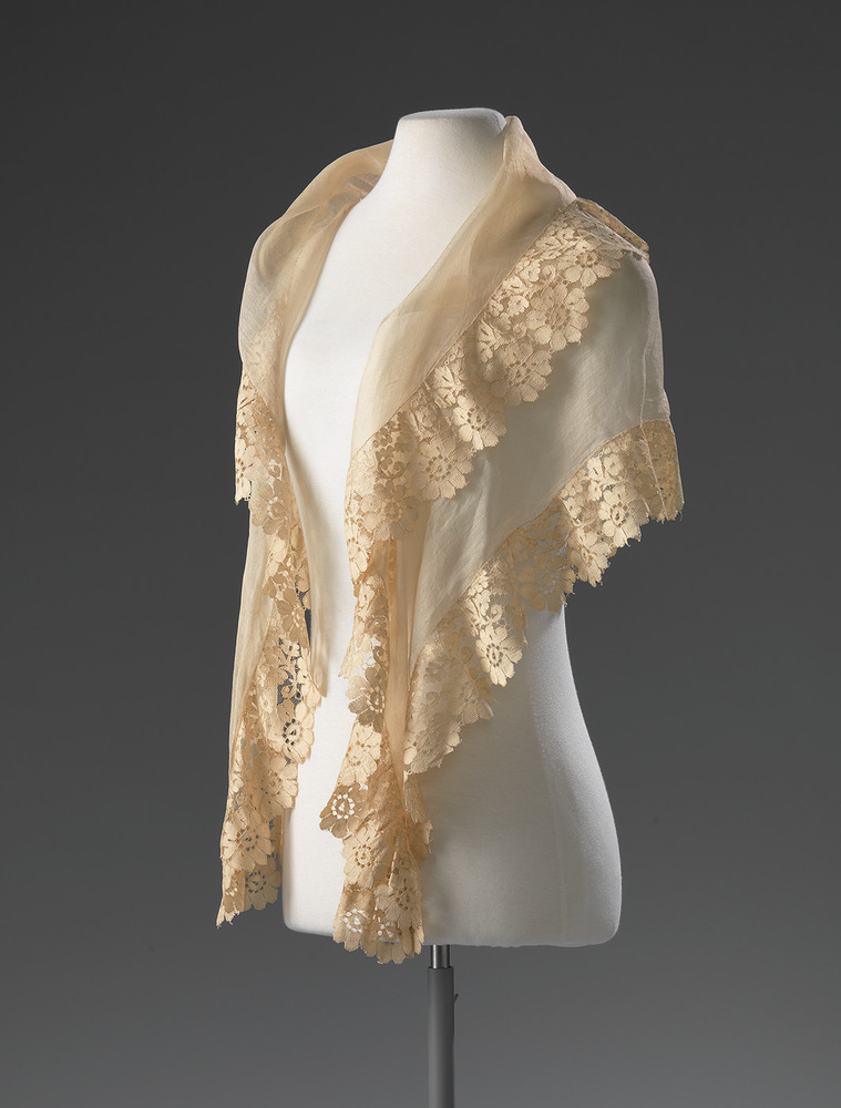Sjaal van dunne zijde voile met machinale blonde (kant) met bloemmotief, in ruitvorm. De sjaal werd dubbel geslagen gedragen zodat een dubbele rand kant zichtbaar was.