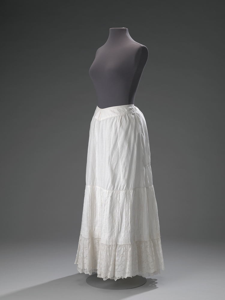 Onderrok van wit katoen met verticale oprijgsels en machinaal kant. Gladde tailleband, die middenvoor in een punt is geknipt en voorzien is van een verticaal knoopsgat. Hiermee kon de onderrok worden bevestigd aan de korsethaak. De tailleband heeft aan de achterzijde een tunnel en twee inhaalbanden om de rok aan te halen.