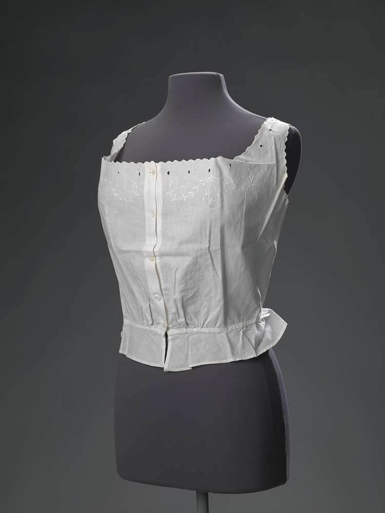 Korsetlijfje van wit katoen met borduurwerk. Langs de halslijn geborduurde gaatjes om een lintje doorheen te rijgen. Middenvoor vijf knopen. Schootje.