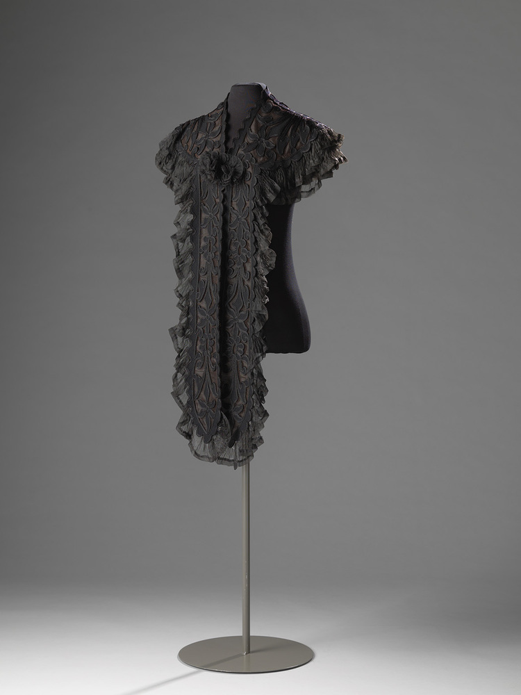 Zwarte mantel of schouderkraag, ter bedekking van het décolleté, met lange slippen met geschulpte randen. Sluiting met twee rozetten. Op de slippen applicaties van bloemen en gepliseerde kant. Zwarte voering van zijde.