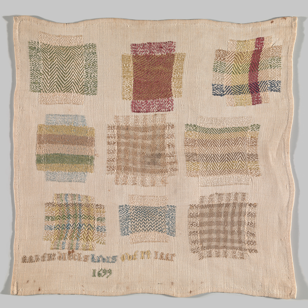Deze doek werd in 1699 voltooid door de veertienjarige Aaltje Dircks Kluis. Haar doek behoort tot de drie oudste stoplappen, die tot nu toe bekend zijn. Kenmerkend voor de drie zeventiende-eeuwse doeken is, dat ze grote tot zeer grote stopgaten hebben, met zeer smalle doorstoppen aan alle vier de zijden. Rond 1730 gaat dit veranderen en worden de stoppen kleiner. Grote gaten zijn veel moeilijker te stoppen dan kleine omdat de handwerkster veel minder houvast aan de stof rondom het gat heeft. De stoppen zijn niet alleen onregelmatig in grootte, maar ook onregelmatig over de doek verspreid. Dit is eveneens een kenmerk voor vroeg gedateerde stoplappen. Aaltje wijkt hiervan af, de negen stoppen zijn evenredig over de doek verdeeld. Antje heeft keurig werk geleverd. Ze gebruikte zijden garen op fijngeweven linnen. Haar naam, leeftijd en het jaar van voltooiing zijn in kruissteek uitgewerkt. (Suzette van 't Hof)