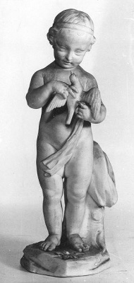 staand naakt kinderfiguurtje met duif in de handen- Trefwoorden