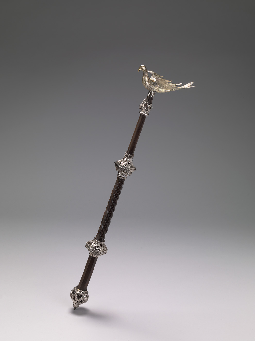 Staf van ebbenhout, samengesteld uit - van beneden naar boven - een achthoekig, een getordeerd en een gladrond deel, gemonteerd met drie zilveren nodi, een sparappel en een vogel. Onderste nodus bolvormig, opengewerkt met traceerwerk en parelrand tussen geprofileerde randen. Tweede nodus zeshoekig, opengewerkt met traceerwerk en parelrand tussen geprofileerde randen. Derde nodus zeshoekig met krans van opgelegde bladranken en deels opengewerkt met traceerwerk. Bekroning met een sparappel waarboven een vogel van verguld zilver. Vogel met naturalistisch gegraveerd verenkleed. Uiteinde onderste nodus, delen traceerwerk en delen sparappel ontbreken.