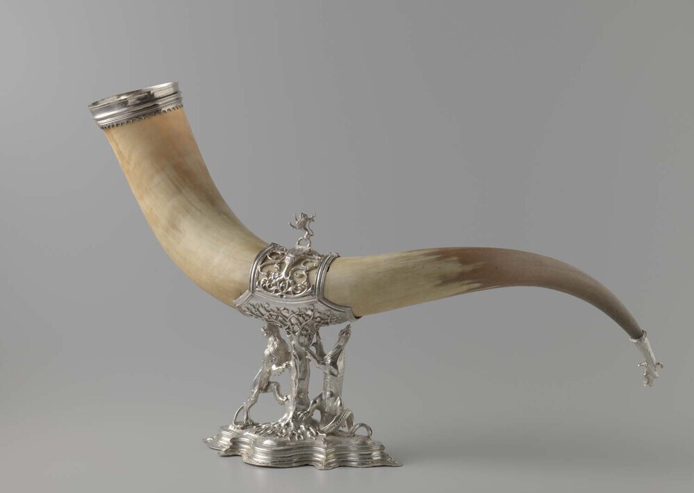 Deze drinkbeker had een ceremoniële functie bij het kloveniersgilde. Hij is gemaakt van buffelhoorn en gevat in zilveren monturen. De voet heeft de vorm van een boom, met aan weerszijden een leeuw en een draak. In de houder is de vogelklauw te zien, die het symbool is voor de kloveniers. Deze klauw draagt het stadswapen van Amsterdam, met daar bovenop als bekroning van het montuur, de Hollandse Leeuw. ( Norbert Middelkoop)