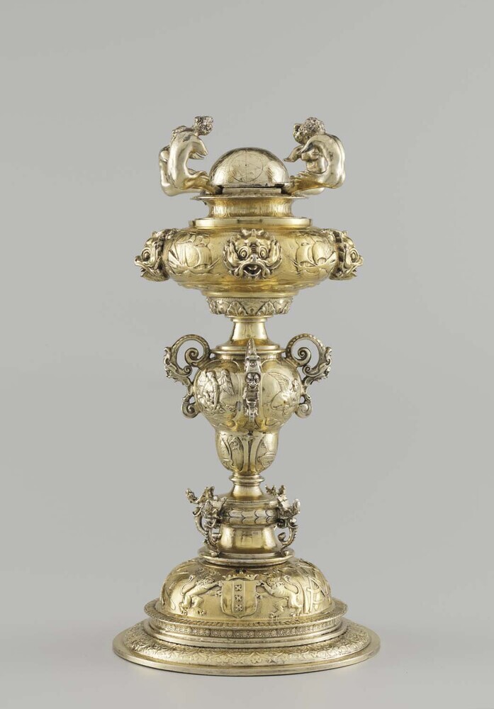 Bekerschroef samengesteld uit gewelfde voet, balustervormige stam en verdikte nodus waarboven halve bol met vier klampen. Gegoten en gestempelde versieringen, deels plastisch gevormd en deel op geruwde ondergrond. Geprofileerde voet met voorstellingen van het koggeschip - het zegel van de stad - en het gekroonde stadswapen van Amsterdam, gehouden door twee leeuwen. Hiertussen eenvoudige attributen van zeevaart en visserij. Platte knoop met vier gevleugelde fabeldieren, samengesteld uit griffioenkoppen en voluutvormige staarten.