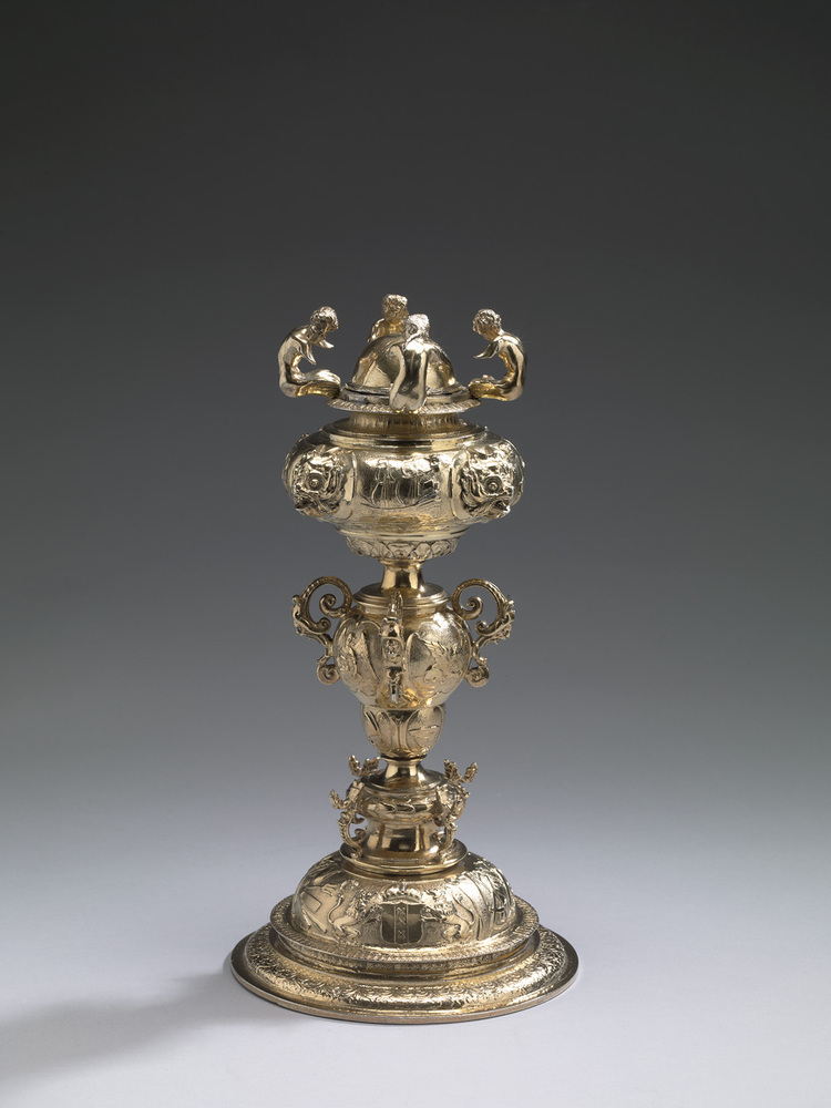 Brede nodus met voorstellingen van vier contemporaine handelsschepen, de vier winden symboliserend, alternerend met koppen van zeemonsters. Basis nodus met straalsgewijs een rand van bladeren. Uitstaande kraag met twee tritons alternerend met twee najaden, fungerend als klampen waarmee drinkglas kan worden vastgeklemd, door middel van een schroefmechaniek in binnenzijde stam.