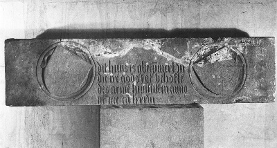 - inscriptie voorzijde: Dit huijs is ghetymert in/ Die ere gods tot behofte/ des arme huijssitten anno/ m cccc en lxxxvi : m cccc en lxxxvi = 1486