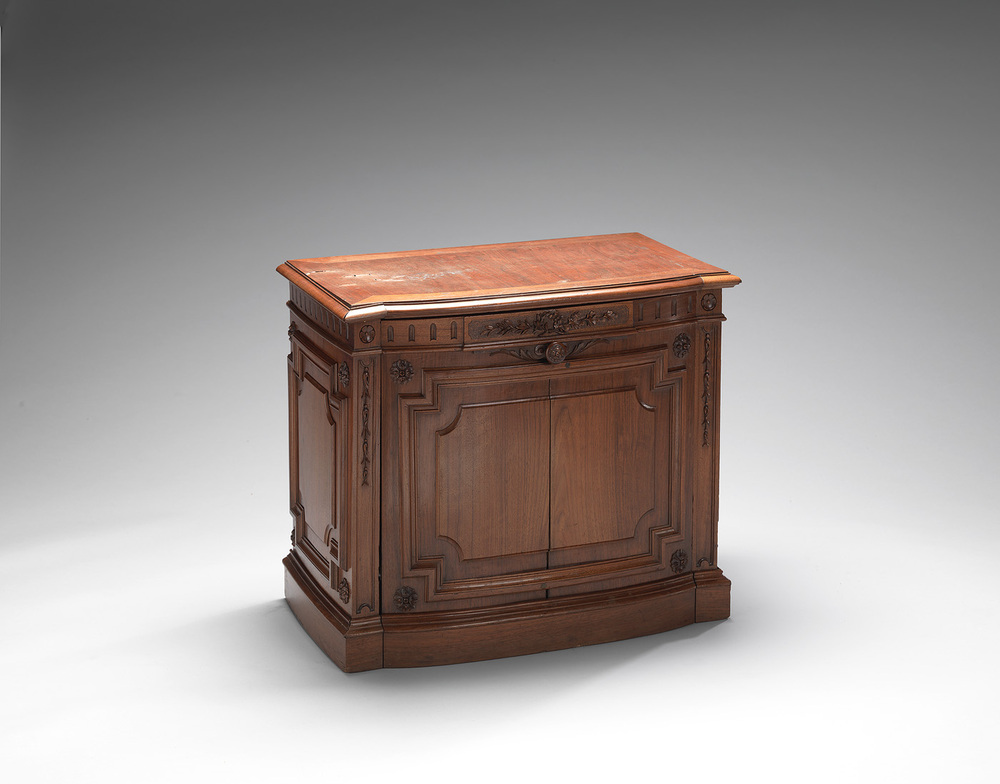 - signatuur/datering achterzijde plint van voorzijde meubel: J. Disfe 1872 : Disfe = Disse : signatuur en datering in inkt op de achterkant van de plint van de voorzijde van het meubel.