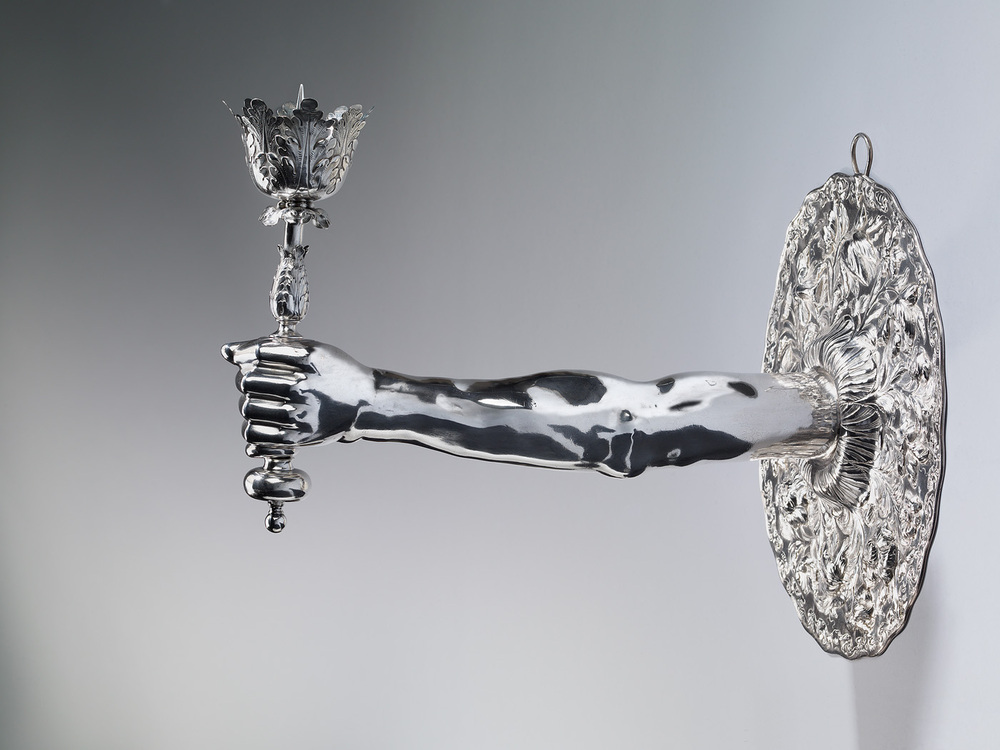 Wandluchter bestaande uit ovale wandplaat en houder in de vorm van een menselijke linkerarm met flambouw. Wandplaat met gegolfde rand en ophangoog. Gedreven decoraties, deels geciseleerd. Rand met kleine kwabornamenten. Plaat met verhoogd middendeel en straalgewijs geplaatste rij acanthusbladeren, waaromheen bloemen. Vanaf middenonder met de klok mee: tulp, kleine tulp, dubbele tuinanemoon, dichtersnarcis, tuinanemoon, trompetnarcis, tulp, dichtersnarcis, tulp, kleine tulp, lis, dichtersnarcis en dubbele tuinanemoon. Verhoogd middendeel met gladde arm en hand, een flambouw houdend. Balustervormige stam met acanthusbladeren en uitstaande kraag van bladeren met parellijst, waarboven kelkvormige kaarsenhouder met dubbele rij acanthusbladeren en kaarsenpin. Onderzijde stam met twee nodi en bolvormige knop.