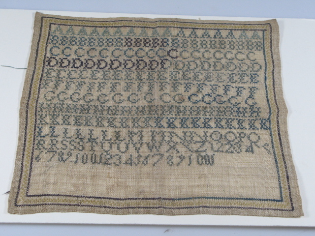 De maakster van deze letterlap uit circa 1900 (1890-1910) is onbekend. Haar doek wijkt af van andere typen. Ze werkt geen volledige alfabetten uit maar oefent de letters één voor één over de volle breedte. Dit komt zelden voor. Na negen regels en zeven L’n op de tiende regel kwam ze mogelijk tot de ontdekking dat de doek, die 28,5 bij 30,5 meet, te klein is om het volledige alfabet op deze manier uit te werken. Wat haar nog rest van het alfabet zet ze achterelkaar, de aantallen per letter variëren. Ze werkt in vrijwel één kleur, grijsblauw. De I en de J ontbreken, de Y is spiegelbeeldig weergegeven. Enkele letters zijn willekeurig in afwijkende kleuren blauw geborduurd. Dit zou erop kunnen wijzen, dat er ‘herstelwerkzaamheden’ zijn verricht; uithalen, uithuilen en opnieuw beginnen?