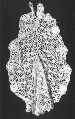 Cremekleurige jabot van gekloste naaldkant van kunstzijde. werd vast gezet op de japon. gedragen door een oudere dame, als het al uit de mode is.- Trefwoorden