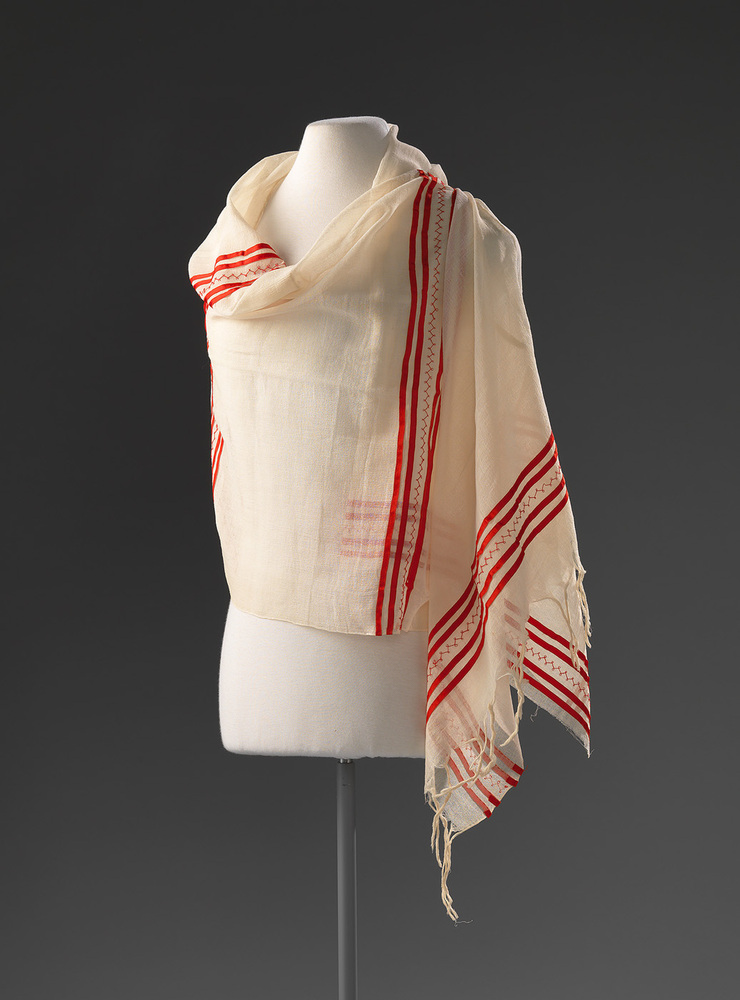 Een deel van de shawl is afgeknipt. De shawl is mogelijk niet-Europees, de shawl past niet in de mode en het naaisel is slordig genaaid.