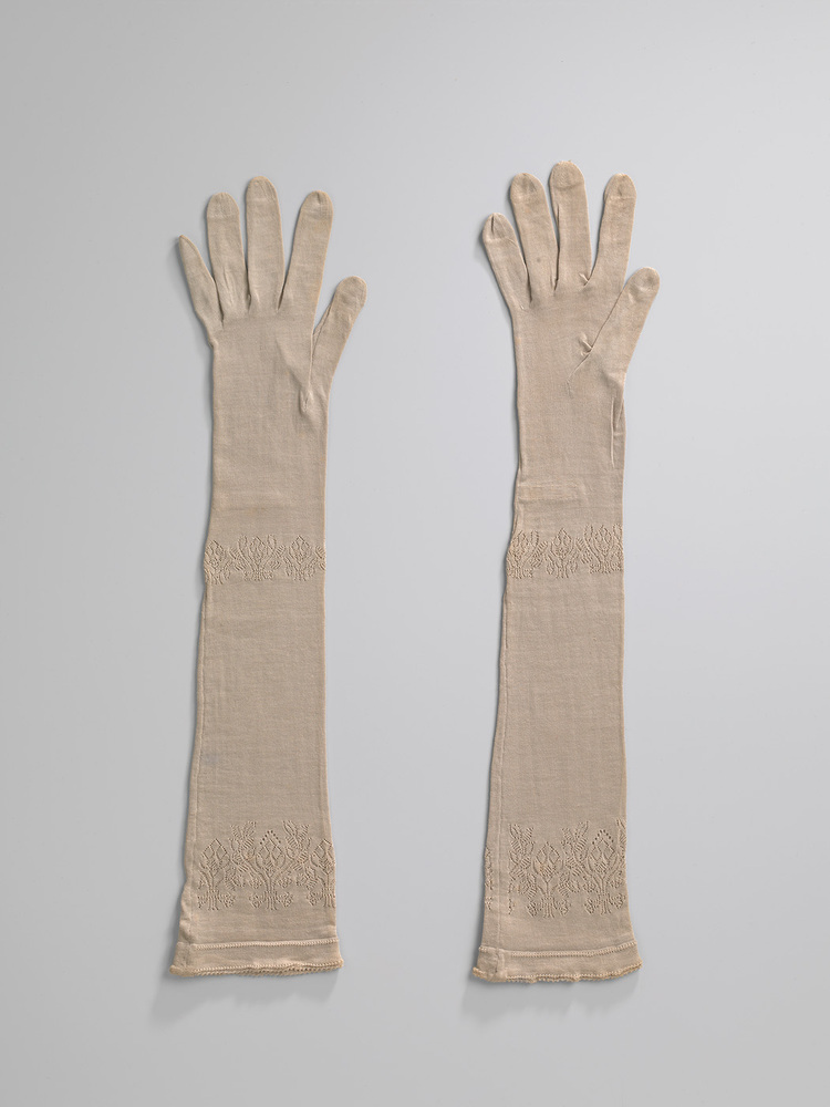 Paar beige lange handschoenen van machinale katoen tricot, met bloemornament langs de pols en en de arm. Elastieken bandje langs de pols.- Trefwoorden
