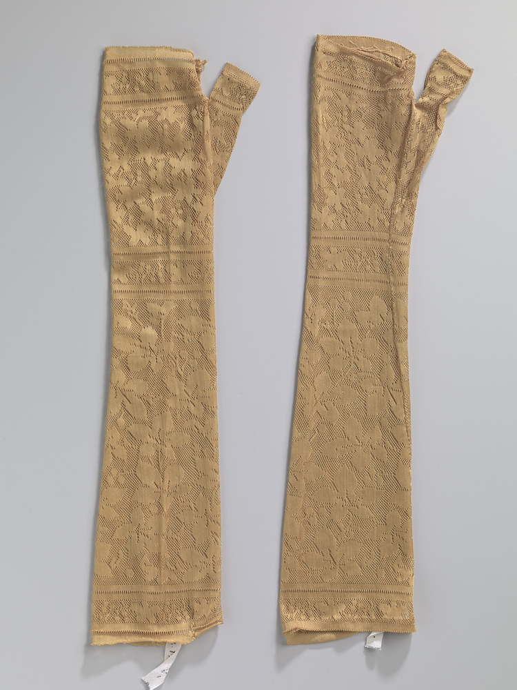 Paar zijden gele mitaines, machinaal breiwerk met ingebreide bladermotief.- Trefwoorden