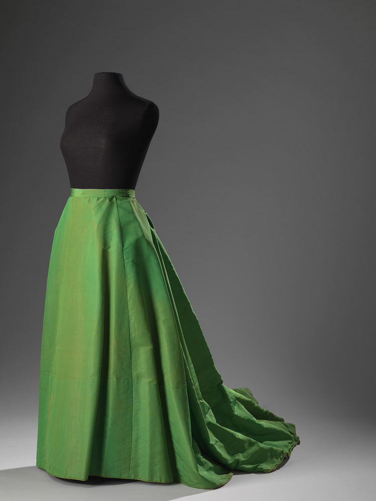 De wijde voorkant en de draperie aan de achterkant van de rok duiden op een late crinoline. De groene kleur is modieus in de vroege jaren '70 van de 19e eeuw. De rok is modieus door de kleur en vorm.
