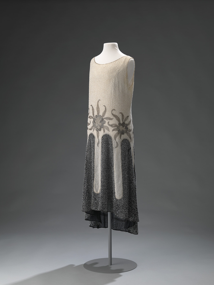 Mouwloze geheel met kralen overdekte avondjapon. De halslijn is rond, aan de achterkant is de hals iets diper en V-vormig. Het bovenlijf is tot aan de verlaagde taille van witte dunne katoen en loopt over de rok uit in acht smalle banen die aan de onderkant rond zijn tot net boven de zoom. De rok van de japon is van zwarte dunne katoen, aan de onderkant geschulpt en is wat langer aan de achterzijde. De gehele japon is in vermicelli patroon bestikt met witte kralen. Op de taille lijn zijn zes zeer grote bloemen van zilverkleurige kralen met harten van strass steen. Dezelfde zilverkleurige kralen zijn aangebracht langs de halslijn, armsgaten en de uitlopende smalle witte banen.
