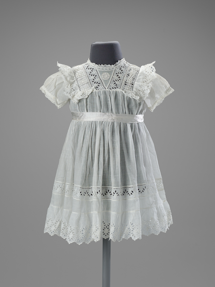 Witte katoen batisten jurkje met ceintuurlint. Met randen van machinale broderie anglaise.