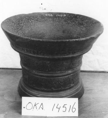 Vijzel, 1736 Amsterdam brons hoogte: 34 cm; diameter: 42 cm; opschrift op de spreidende rechte rand: ALEWYN CROMBOSCH AMSTERDAM ANNO 1736