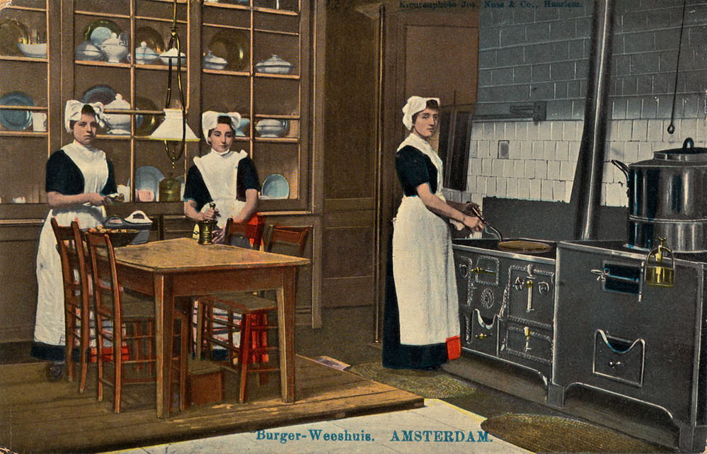 In het Amsterdamse Burgerweeshuis konden kinderen van Amsterdamse poorters (burgers met rechten om in de stad te wonen) terecht, die geen ouders of een moeilijke thuissituatie hadden. Het weeshuis was eeuwenlang een gesloten instelling, waar buitenstaanders niet zomaar naar binnen mochten. Voor de creatie van een fotoalbum, ter ere van het 25-jarige huwelijk van bouwkundige Pieter Heyn in 1904, werd een uitzondering gemaakt. Fotograaf August Stap maakte een unieke serie foto’s van het interieur, de wezen en het personeel van het Burgerweeshuis. Op de foto’s zijn de Burgerwezen tijdens hun dagelijkse bezigheden te zien. Zo komen onder meer de naailes voor meisjes, het ‘Slöjd’-onderwijs voor jongens en de zondagse gang op weg naar de kerk voorbij. Een groot aantal van de foto’s zijn later gebruikt voor de productie van een serie ansichtkaarten in kleur, waaronder deze ansichtkaart van weesmeisjes in de keuken van het Burgerweeshuis. ( Sarah Remmerts de Vries)