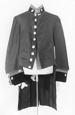 Het kostuum der ruiters bestond uit rok en pantalon van blauw laken met vergulde knopen en fluwelen staande kraag, mouwopslagen en klepper met goud geborduurd.
