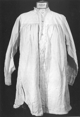 Het witte damesnachthemd (zg. "Amersfoort") is afgewerkt met machinale kantjes en heeft een rood merkje "D.K." "W.75".- Trefwoorden