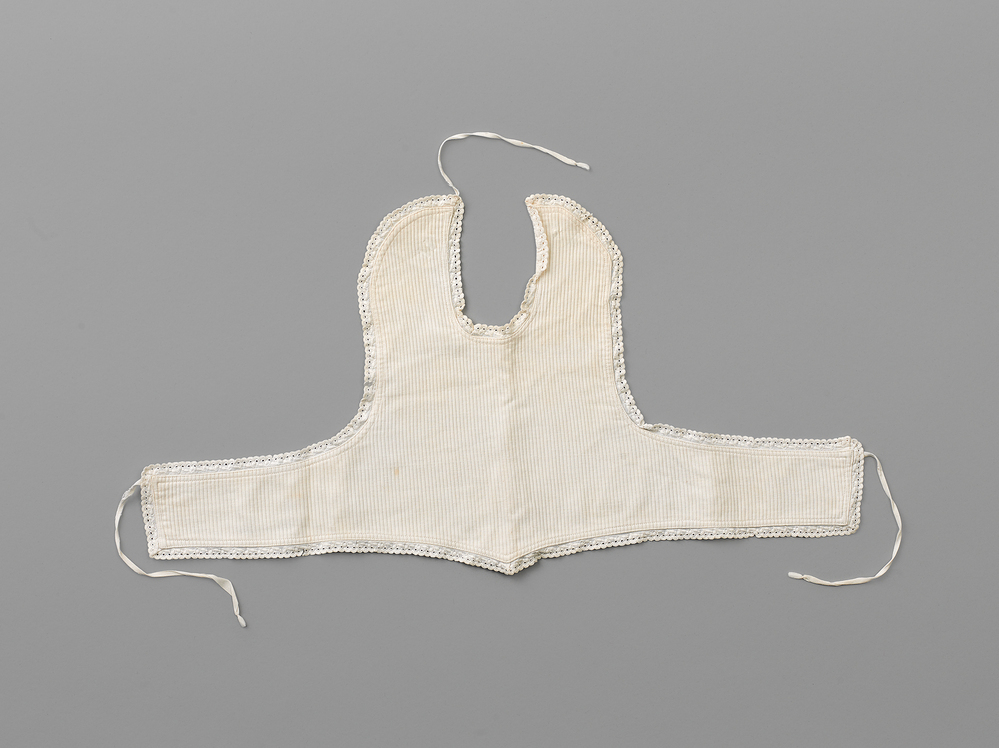 Witte katoen met ingeweven ribbel, gevoerd met effen katoen. Langs de randen band met open werk, gemaakt met handborduurmachine. Sluiting rond de hals en om het lijfje aan de achterzijde met banden. Een band ontbreekt bij de hals. Label met initialen: L.V.
