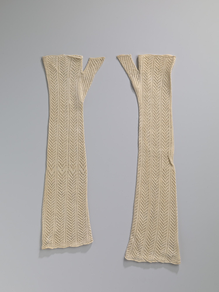 Paar gebreide mitaines van katoen met ajour breiwerk, zonder onderscheid tussen links en rechts. Oorspronkelijk zijn de mitaines geen paar, de ene is korter dan de andere.- Trefwoorden