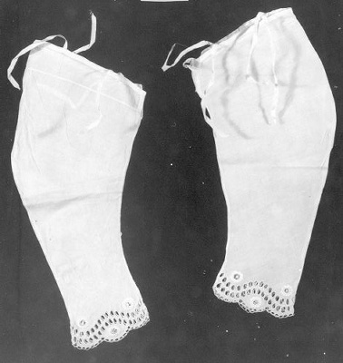 Paar witte katoenen ondermouwen, met geborduurd en gefestonneerd randje. Ze zijn rond 1860-1870 te dateren doordat ze al gebogen zijn, met de elleboog vorm erin.Ze mouwen zijn open afgewerkt, en later dicht geregen. Zie ook KA 14896.1/2. en KA 14895.1/2. Waarschijnlijk voor een groter meisje, mede door de vier strikbanden langs de bovenzijde.