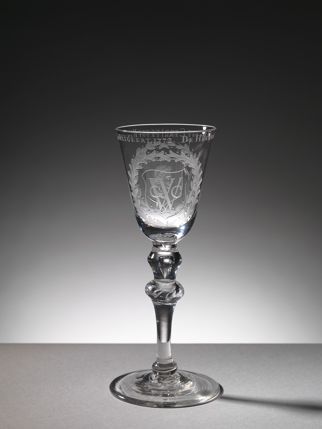 Helder kleurloos glas. Conische voet. Balusterstam met luchtbellen, knoop en luchtbel. Conische kelk met afgeronde basis. Op kelk het omkranste familiewapen van Hendrik Hooft Gerritsz. Op andere zijde een met eikenbladeren omkranst schild waarin het monogram: GWC/. Hierboven het opschrift: DE HEER EN MR HK HOOFT GERRITS. TOT BEWINDHR GEELIGEERT, 1772./.