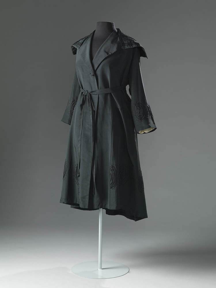 Zwarte zijden mantel of jas met kraag en V-hals en versieringen van gevlochten band op de kraag, mouwen en langs de zoom. Sluiting met knopen en ceintuur. Het ceintuur zit hoger dan de taille, dit past in de mode rond 1915. De slobberige kraag past in de periode net na de Eerste Wereldoorlog. De manteln heeft een halve voering van lichtgekleurde stof.